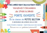 Le vendredi 5 décembre, une porte ouverte de la classe de petite section sera proposée aux futurs élèves, nés en 2023. N'hésitez pas à partager l'information.
